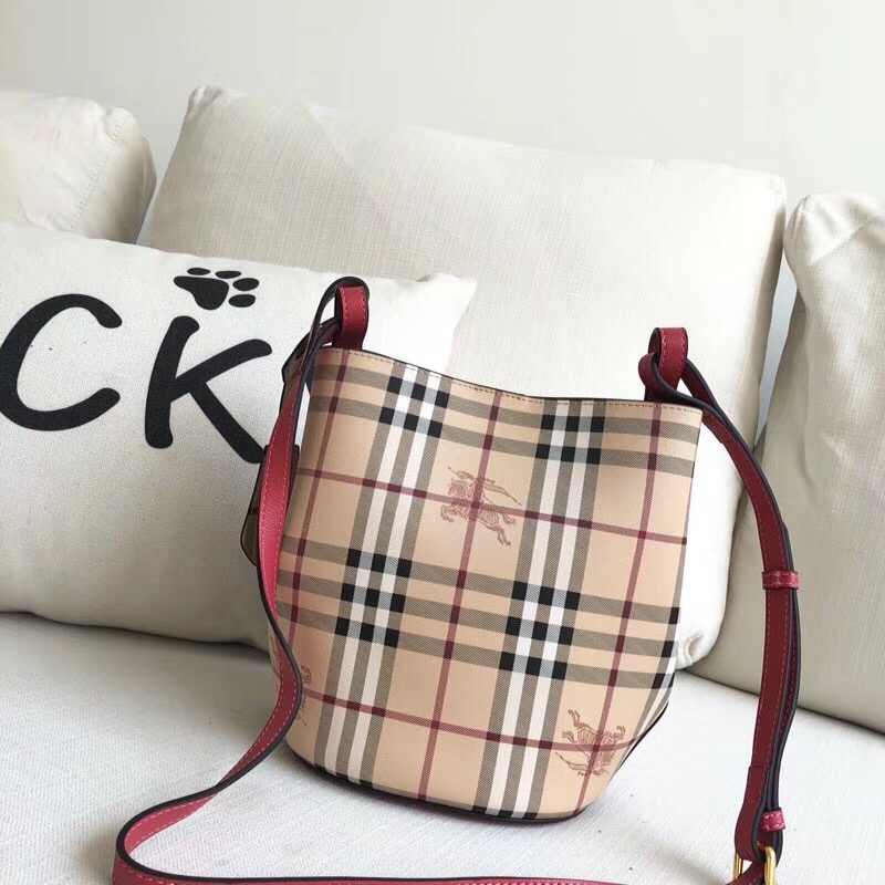 Burberry巴寶莉 Haymarket格紋 戰(zhàn)馬印花 拼色皮革 水桶包 淡紅