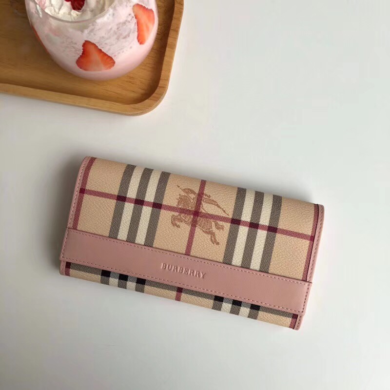Burberry巴寶莉 經典格紋按扣 戰馬印花 女士長款錢包 裸粉