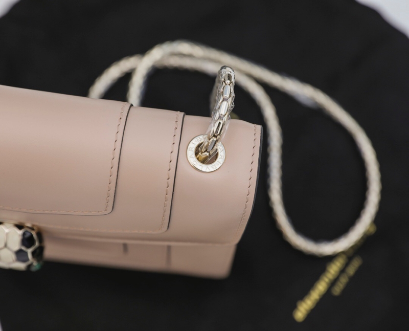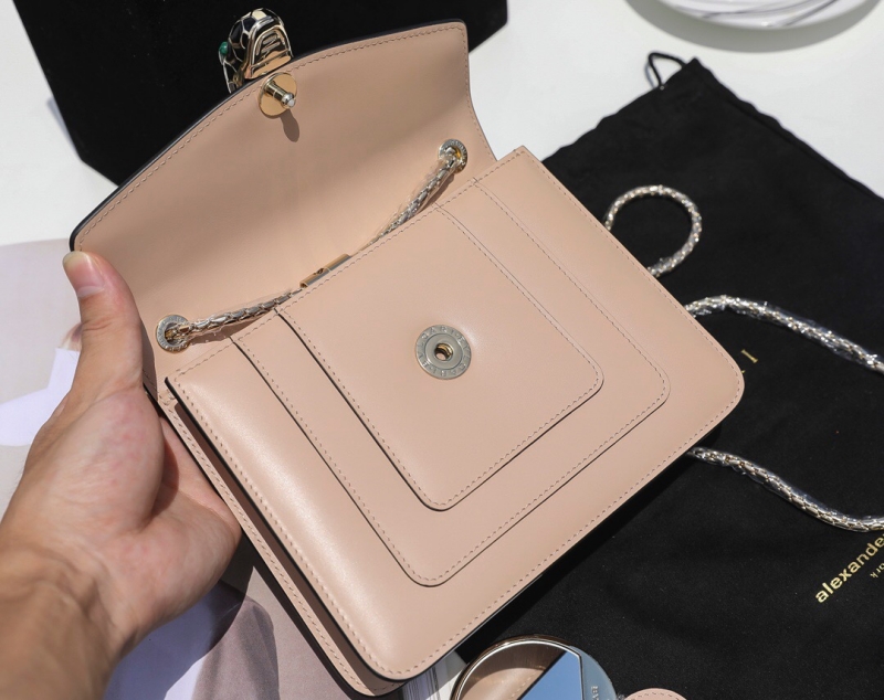 • 結構:淺金鍍金包鏈,呈現蜿蜒盤旋的蛇身靈感元素,搭配一個內部敞口口袋和一面小化妝鏡。小號,單個收納層,一個鐫刻BVLGARI寶格麗品牌標識的內側皮革銘牌。