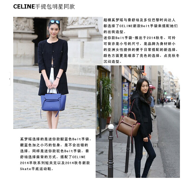 • 詳細介紹:早前的2015春夏巴黎時裝周期間,秦舒培、劉雯、奚夢瑤三位頂有名的超模都拎起了同一款手袋,它就是——Celine Belt Bag!作為2015早春最新款,拋光小牛皮、荔枝紋款依舊第一時間讓你選,這身價過萬的小物絕對是今冬最靚的一景,潮咖們速速入手搶先背起來~