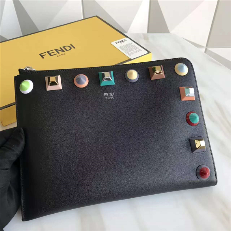 FENDI 芬迪 0365L 新款柔軟小牛皮彩色鉚釘環(huán)繞拉鏈?zhǔn)帜冒?黑色