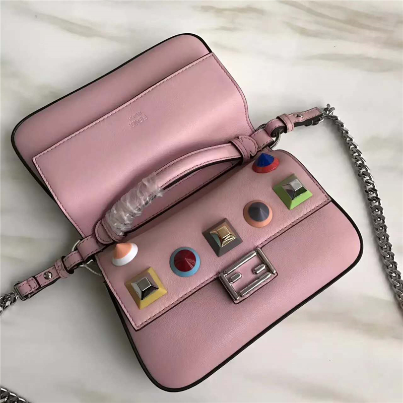 當前位置: 首頁>Fendi|芬迪>Fendi女包> FENDI 1765 17新款小牛皮彩色鉚釘包 兩面開合 雙F扣鏈條包 粉色