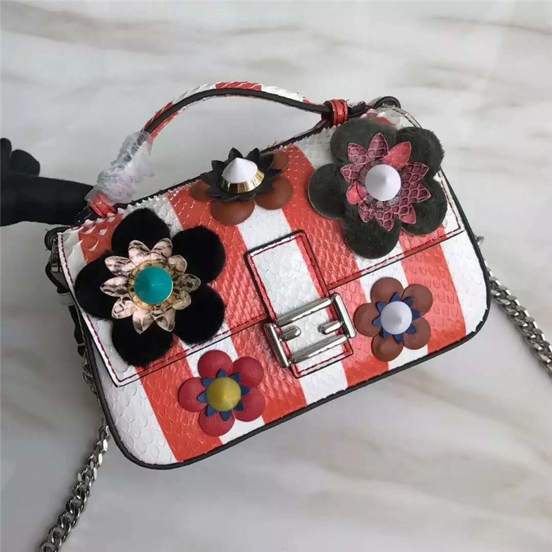 • 詳細介紹:FENDI 芬迪 時裝秀DOUBLE MICRO BAGUETTE采用五金鏈條鍍金鏈式肩帶和金屬配件,質感清新,色澤均勻,耐磨 耐用。由兩個包組成,一面是水蛇皮質,另一面則是蟒蛇皮質。飾以多姿多彩的FLOWERLAND花朵。兩面均設有暗扣翻蓋 和裝飾性雙F標志搭扣。兩面開合。細致做工,色澤亮麗,造型簡約大氣!