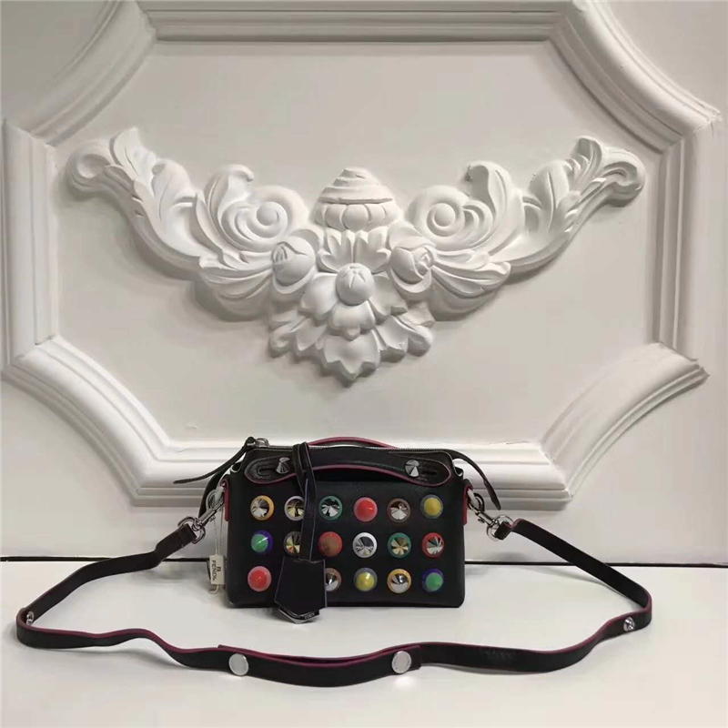 • 詳細介紹:FENDI 芬迪 波士頓小牛皮手提包正面飾以彩色亞克力和金屬釘飾,質感清洗,色澤均勻,耐磨耐用,撞色毛邊。雙提手和可拆卸肩帶。頂部拉鏈和內袋。FENDI ROMA標志和鍍鈀金屬配件。細致做工,色澤亮麗,造型簡約大氣!