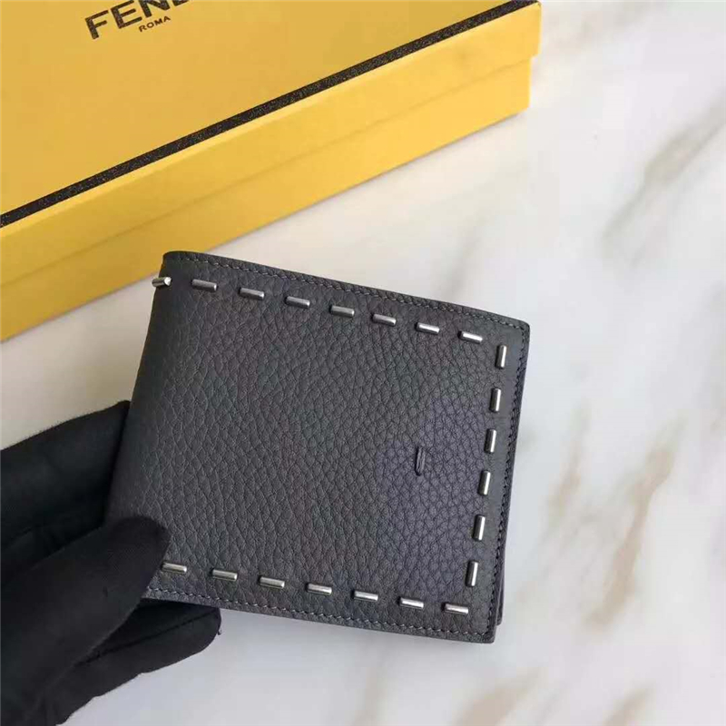 • FENDI 芬迪 荔枝紋白叻釘 羅馬SELLERIA橫式皮夾 黑灰色