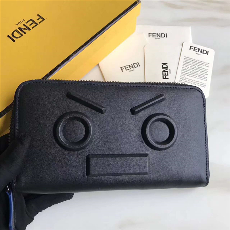 FENDI 芬迪 2017新款 face浮雕同色貼花 三面拉鏈皮夾 啞光黑