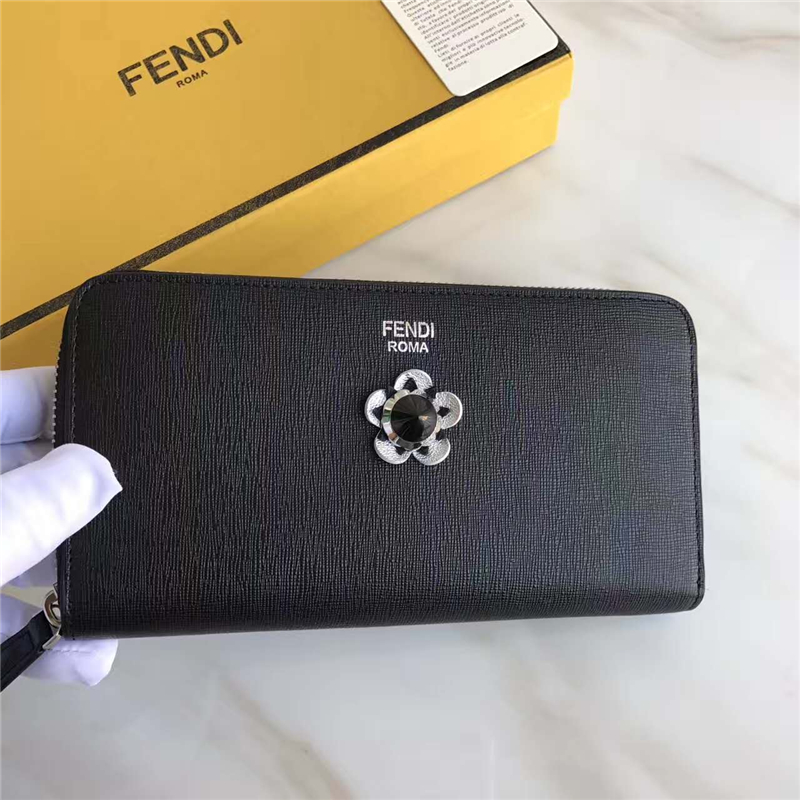 FENDI 芬迪 小牛皮CRAYONS 2017新款 裝飾雙色皮革水晶花朵長款錢包 黑色