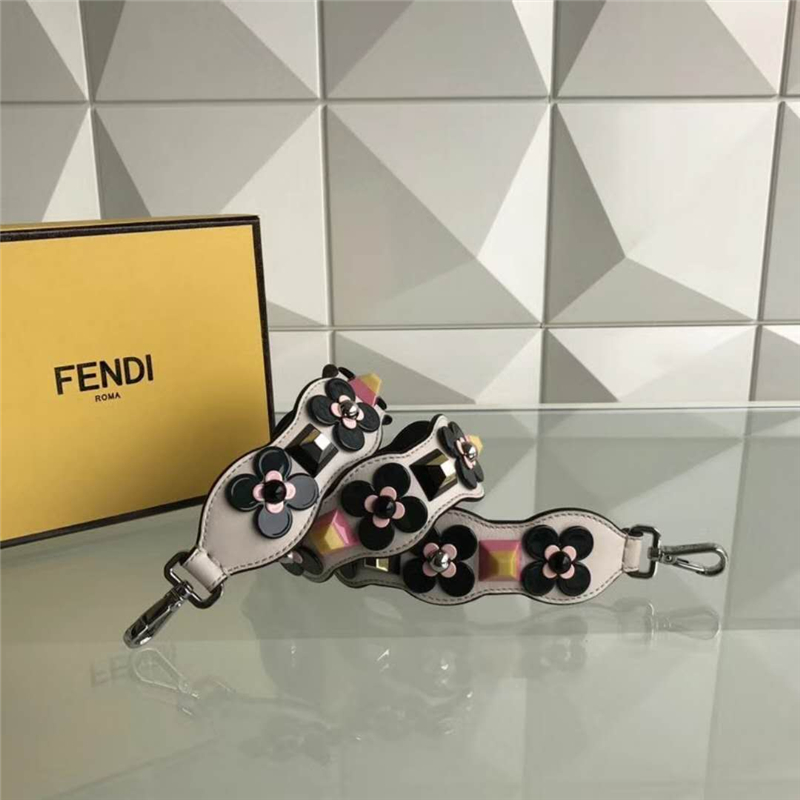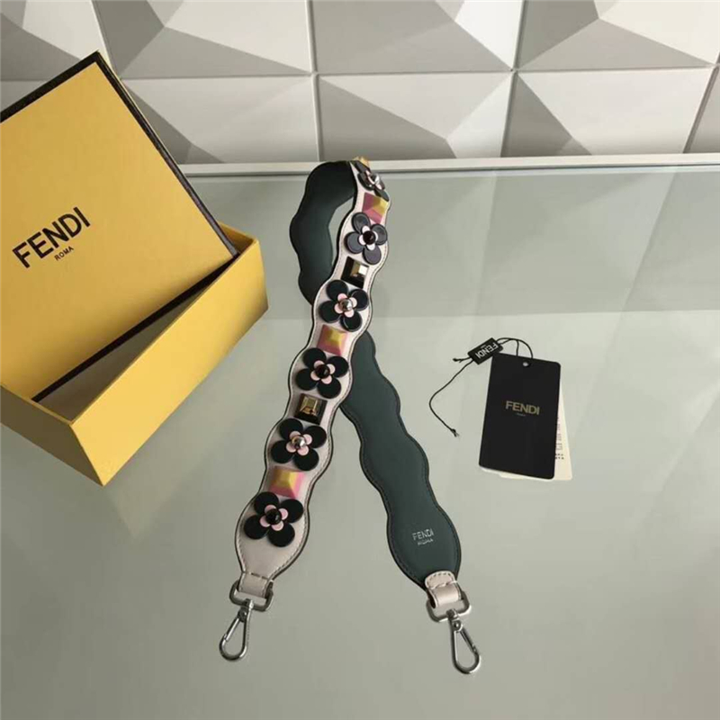當前位置: 首頁>Fendi|芬迪>Fendi腰帶/配飾> 822 Fendi芬迪 拼色肩帶 花朵金字塔形鉚釘 炫彩短肩帶 米色拼灰