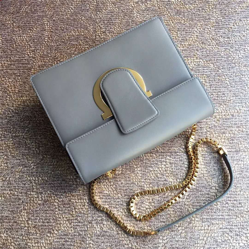 21G671 Ferragamo 菲拉格慕 半環搭扣 小牛皮 大號翻蓋 鏈條包 灰藍