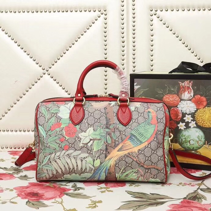 - 409527 GUCCI GG Blooms花鳥(niǎo)印花 帆布拼皮 波士頓手提包 紅色