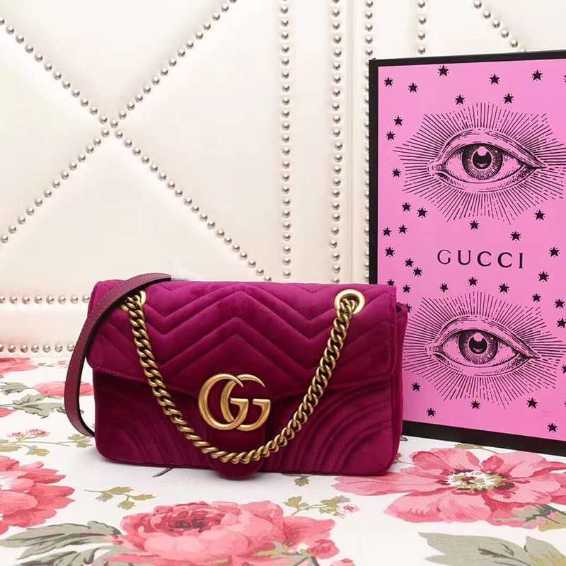 • 443947 Gucci女包 GG Marmont系列 天鵝絨 小號 古馳鏈條包 Gucci斜挎包 玫紫色
