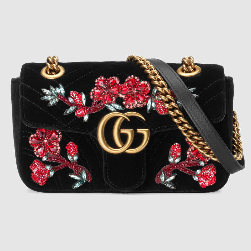 當前位置: 首頁>Gucci|古奇>Gucci女包> 446744 GUCCI GG Marmont系列 刺繡 人形花紋天鵝絨 迷你手袋 黑色