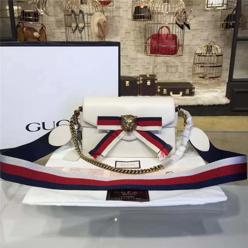453778 Gucci Broadway 虎頭扣 三色織帶 真皮手拿包 鏈條包 白色