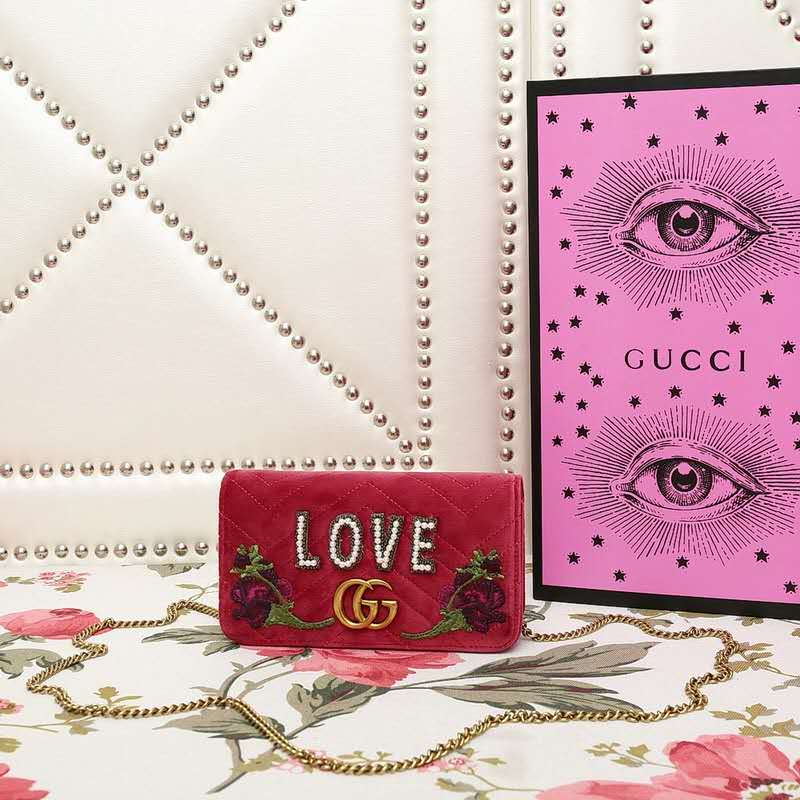• 488426 Gucci女包 GG Marmont系列 LOVE珍珠圖案 天鵝絨 古馳刺繡迷你手袋 紅色