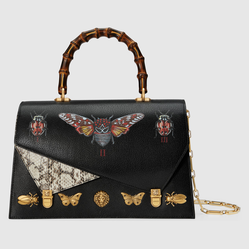 - 詳細(xì)介紹:Ottilia 系列小號(hào)皮革手提包,昆蟲(chóng)印花—甲殼蟲(chóng)、飛蛾、瓢蟲(chóng)和蝴蝶—井然有序并帶有編號(hào),在GUCCI反現(xiàn)代實(shí)驗(yàn)室的部分展示柜中精致呈現(xiàn)。這些怪誕且迷人的標(biāo)志貫穿2017秋冬系列,與標(biāo)志性的竹節(jié)提手并駕齊驅(qū)。手提包造型結(jié)構(gòu)精巧,襯里(結(jié)構(gòu))帶有隔層,配以雙翻蓋扣。重疊雙翻蓋,其中一個(gè)采用撞色蛇皮制作。翻蓋上裝飾昆蟲(chóng)展示印花背面裝飾“XXV”印花。每個(gè)翻蓋上都配有雙夾扣,虎頭夾扣:一個(gè)鐫刻“GUCCI”,另一個(gè)裝飾“Loved”。
