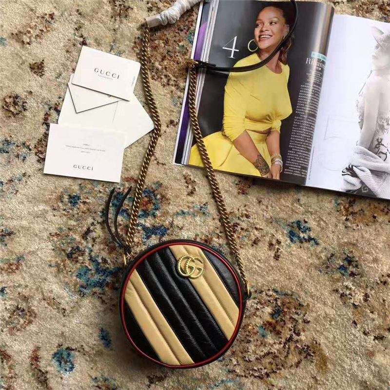• 550154 Gucci手袋 GG Marmont 斜紋絎縫皮革 圓形 Gucci迷你肩背包 米配黑