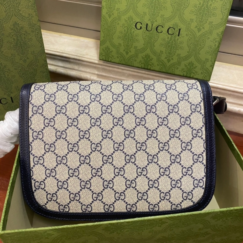 - 結構:米色和藍色GG Supreme帆布,環保材料 藍色皮革滾邊 金色調配件 絨面材質質感超細纖維襯里 正面馬銜扣細節 兩側半馬銜扣細節 每款手袋隨附一個收納小袋,內置兩個額外的紐扣帽,可用于在肩帶拉長時遮住外露的飾鈕 三層接檔以及一個拉鏈口袋和一個開口口袋 背帶上配按扣,長度可從25厘米調至45厘米 翻蓋扣