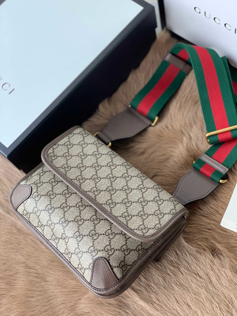 - 結(jié)構(gòu):米色/烏木色GG Supreme高級(jí)人造帆布,環(huán)保材料,配棕色皮革滾邊 黃銅配件 飾金屬貓科動(dòng)物頭像橢圓形Gucci皮革標(biāo)牌 紅綠織帶肩帶 正面和背面翻蓋口袋 內(nèi)部開口口袋 可調(diào)節(jié)肩帶(51厘米高) 小號(hào)尺寸:22厘米(寬)x 16.5厘米(高)x 4厘米(深) 棉麻襯里