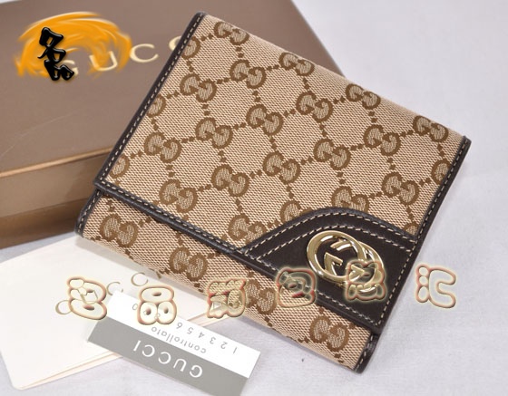 - 181596 Gucci經(jīng)典款 雙G花布時尚女士錢包 Gucci短款錢包 Gucci女包 杏配深啡色