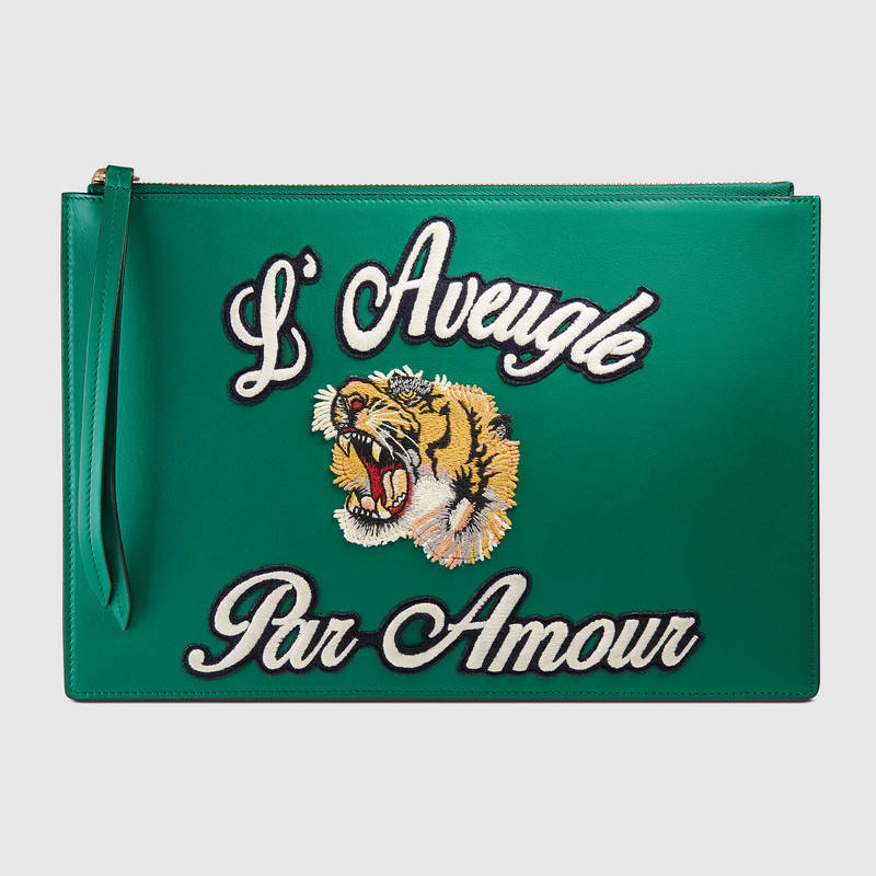 • 詳細介紹:皮革手拿包,配以老虎和“L'Aveugle Par Amour(執迷于愛)”貼花刺繡。