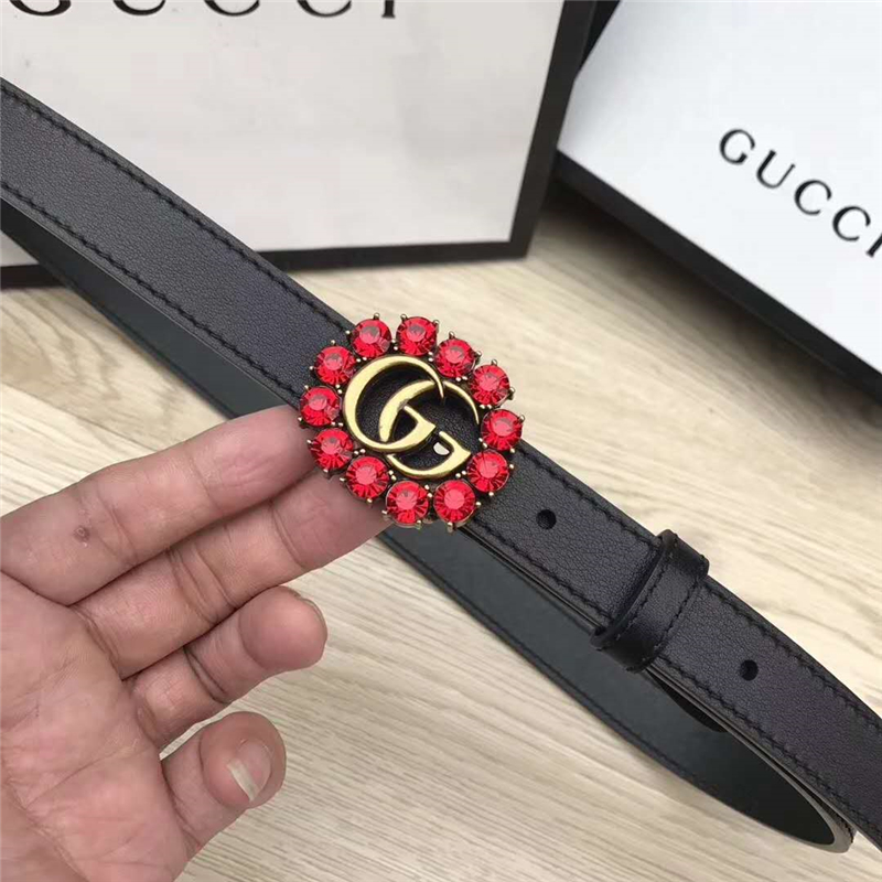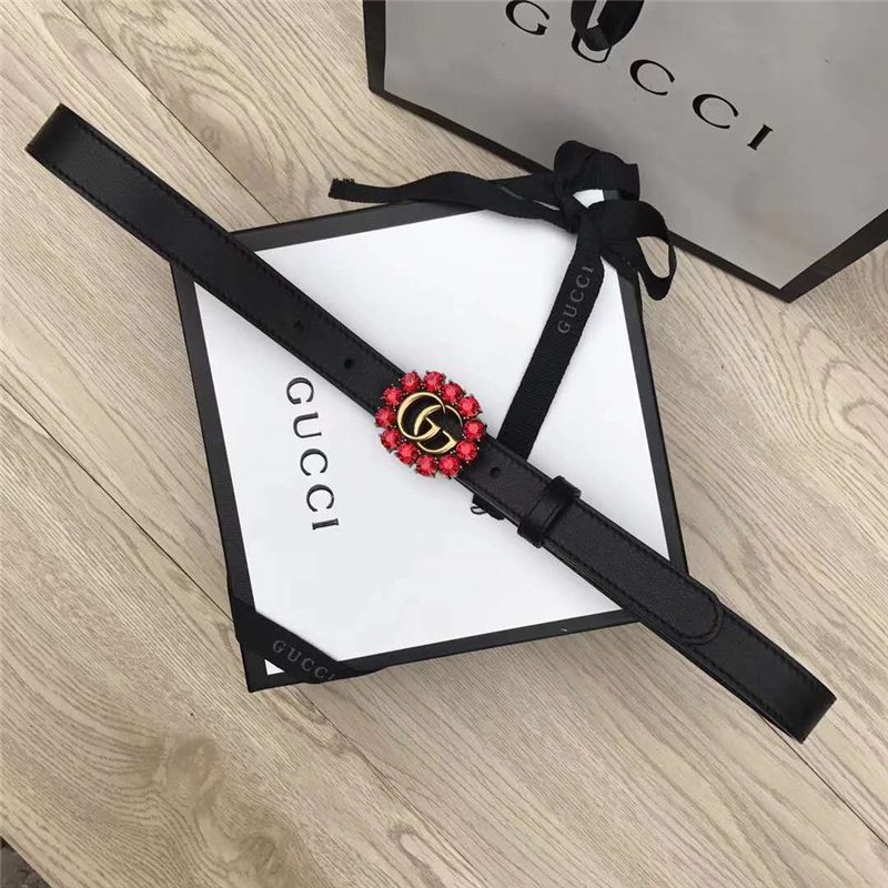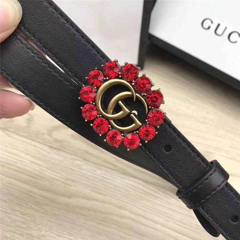 Gucci 模特走秀款 紅色水晶 雙G帶扣 皮革腰帶 黑色