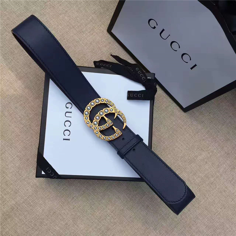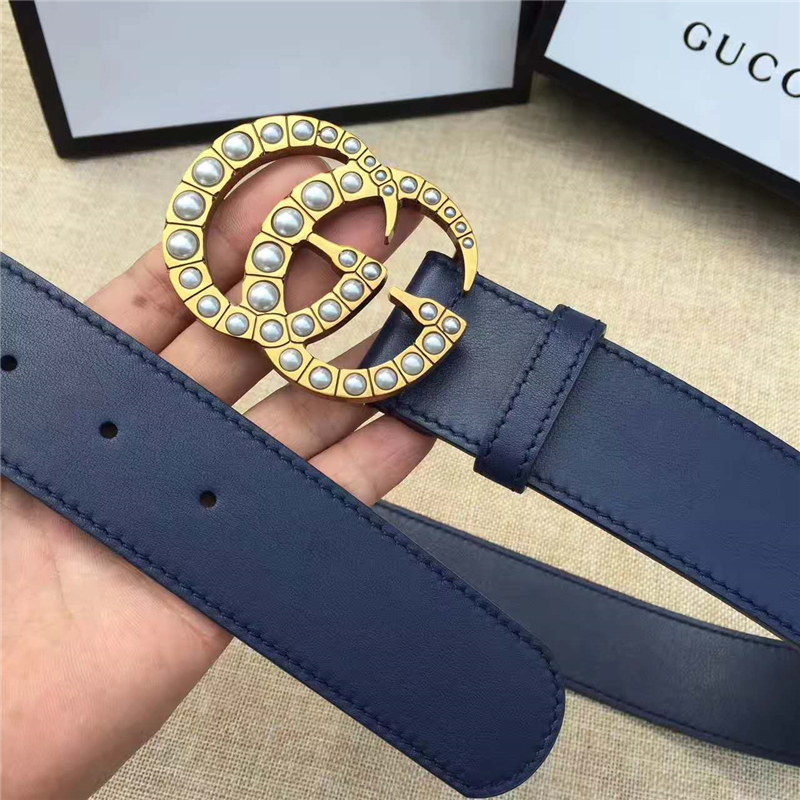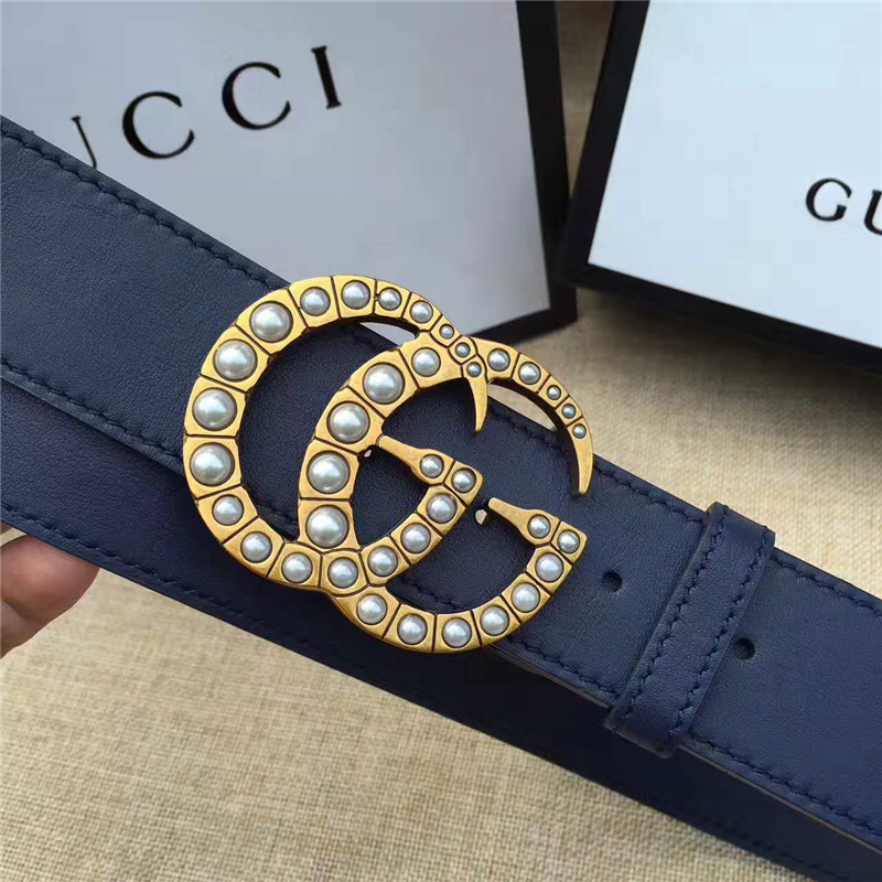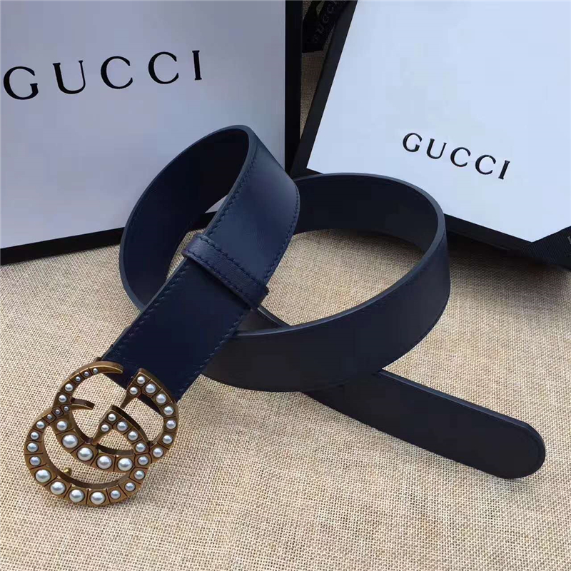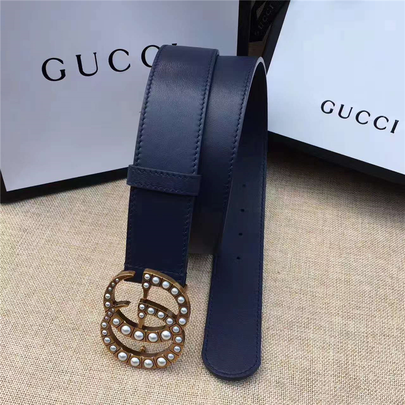 • Gucci 原版牛皮搭配原單仿古銅珍珠雙G扣頭 腰帶 彰顯超凡品味 頂級精品 藍色