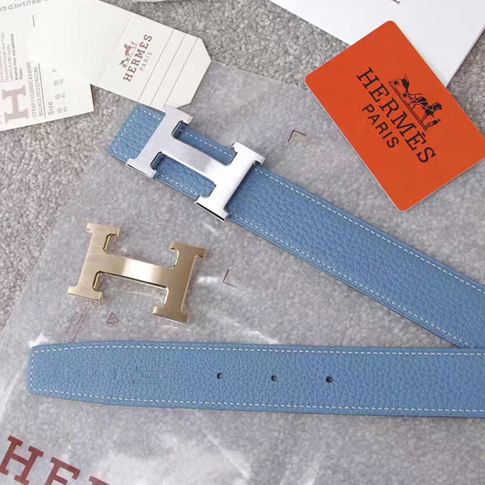 • 愛馬仕腰帶 Hermès 愛馬仕原單腰帶 經典H拉絲扣頭 海外進口荔枝紋帶條 淺藍色