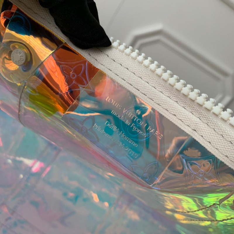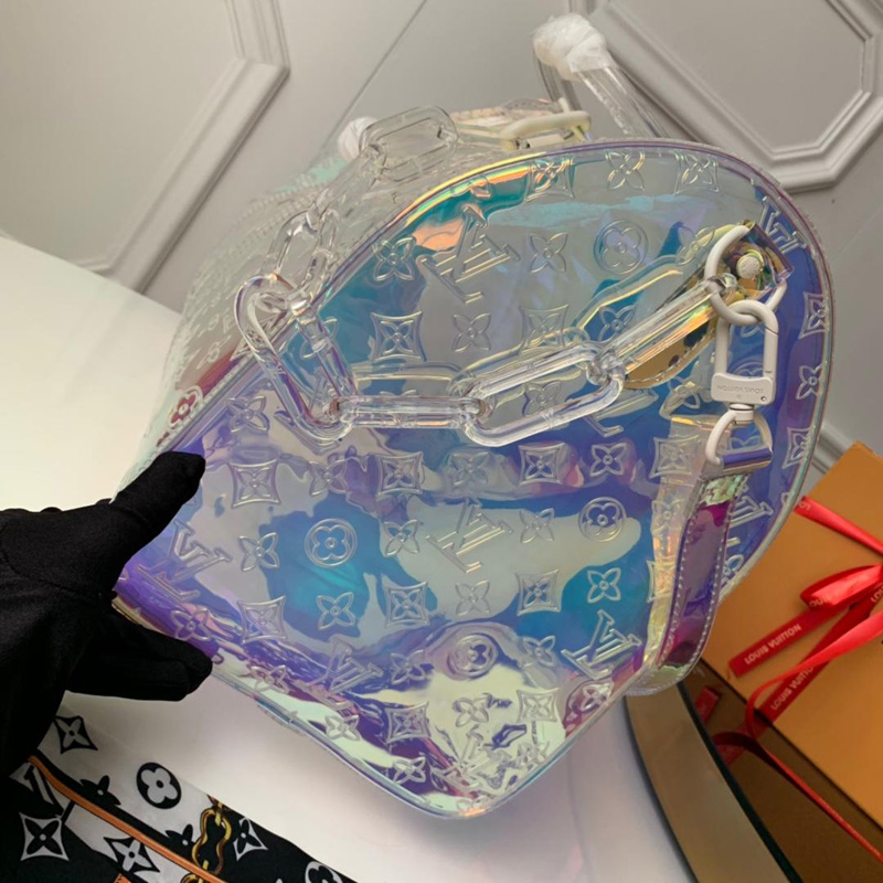 • 結(jié)構(gòu):煥彩棱鏡透明Monogram印花PVCPVC飾邊白色飾件頂部配有手柄,適合手提或手挎皮質(zhì)手柄固定套雙拉鏈開合設(shè)計皮革包裹掛鎖飾件樹脂鏈帶可拆卸皮革肩帶,方便肩背或斜挎