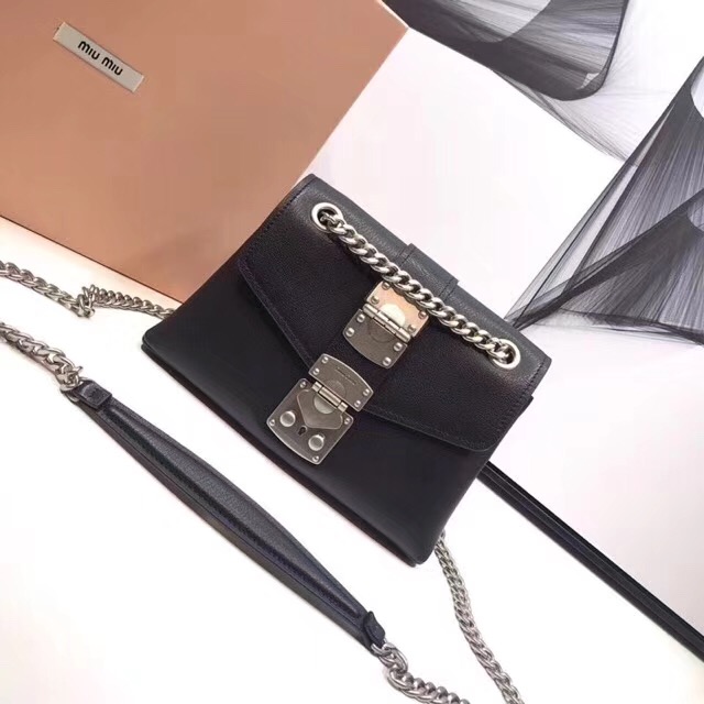 5BD100 MIUMIU 專柜最新 牛皮山羊紋 按扣鎖 小號 翻蓋單肩包 黑色