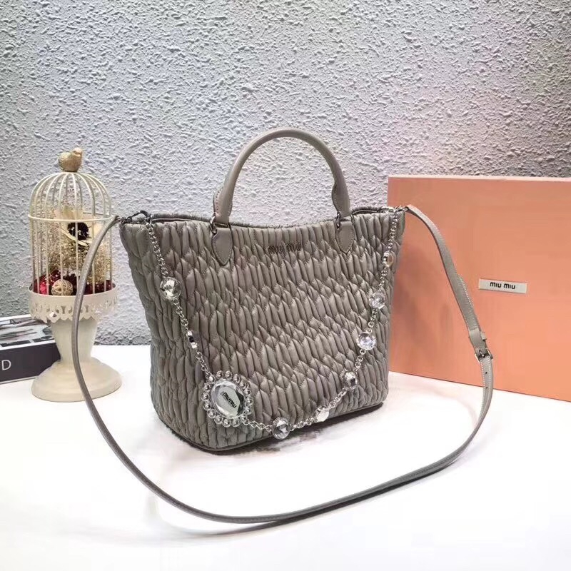 5BE896 MIUMIU繆繆 專柜新款 褶皺羊皮 水鉆鏈條 手提包 灰色
