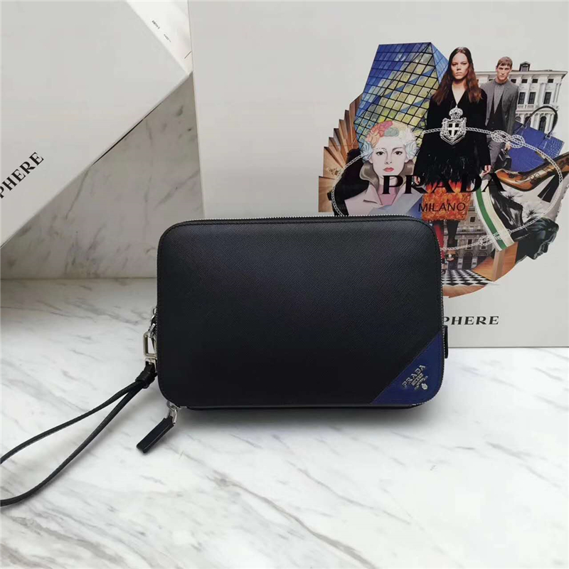 2VF052 Prada普拉達 男士經(jīng)典升級版 拼角嘜 男士雙拉鏈手抓包 黑包寶藍色標
