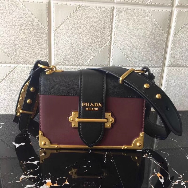 1BD045 Prada cahier 全新升級版 十字紋牛皮 古銅裝飾 手袋 黑拼褐紅