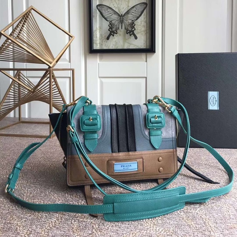 1BD093 Prada普拉達(dá) Etiquette手袋 小牛皮 拼色手工 肩背包 肉桂色配孔雀藍(lán)