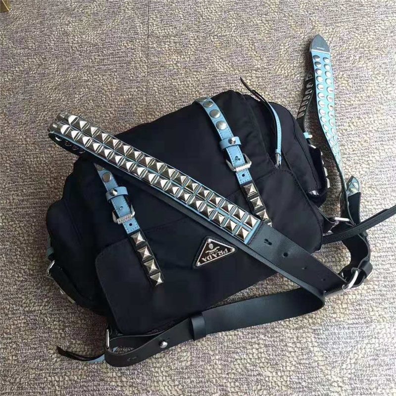 當前位置: 首頁>Prada|普拉達>Prada女包> 1BD118 Prada女包 尼龍面料 鉚釘裝飾 進口牛皮 普拉達單肩包 黑配藍