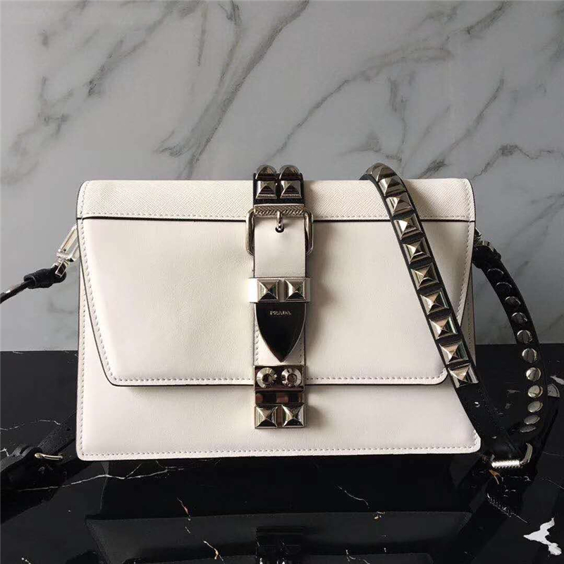 • 1BD120 Prada普拉達 2018早春最新款 鉚釘裝飾 小牛皮手袋 白色