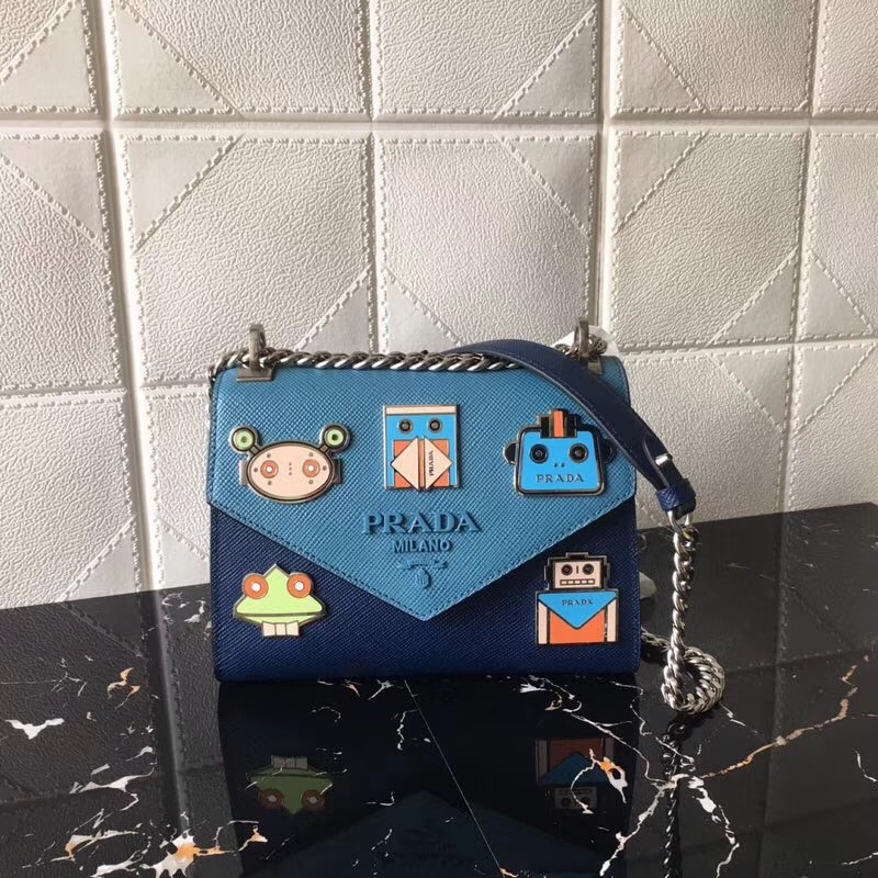 1BD127 Prada普拉達 Monochrome 十字紋牛皮 信封鏈條包 海藍配天藍色