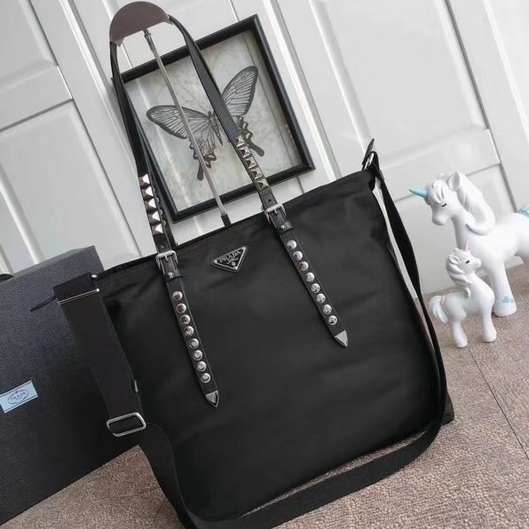 1BG212 Prada女包 鉚釘裝飾 尼龍面料 普拉達(dá)手提包 Prada單肩包 黑色