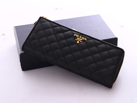 - 1M1183 Prada錢包 牛皮格子車線半開式女士錢包 普拉達錢夾 Prada最新款 黑色金鏈
