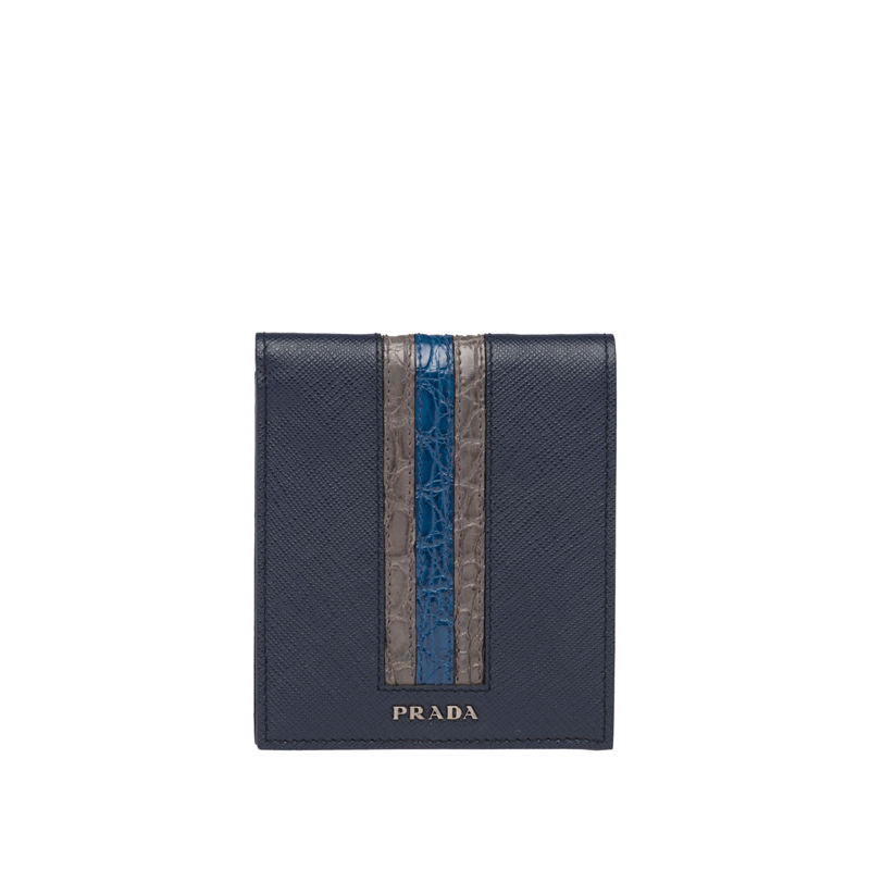 2MO513 Prada普拉達 Saffiano配鱷魚皮 雙折短錢夾 海藍拼灰