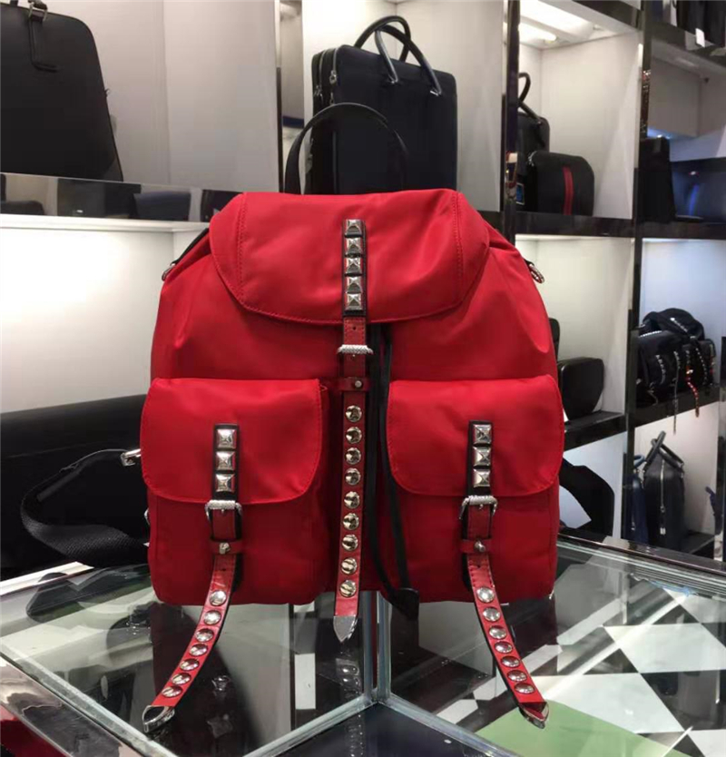 1BZ2811 Prada Black Nylon背包 柳釘扣帶 尼龍配牛皮 普拉達雙肩包 紅色