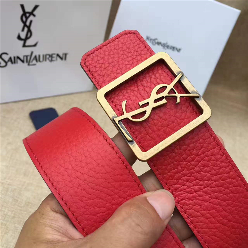 • 圣羅蘭YSL女士腰帶 頭層牛皮荔枝紋 實心復古銅扣頭 雙面可用 紅色