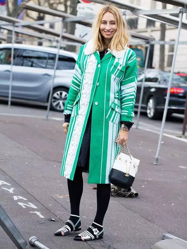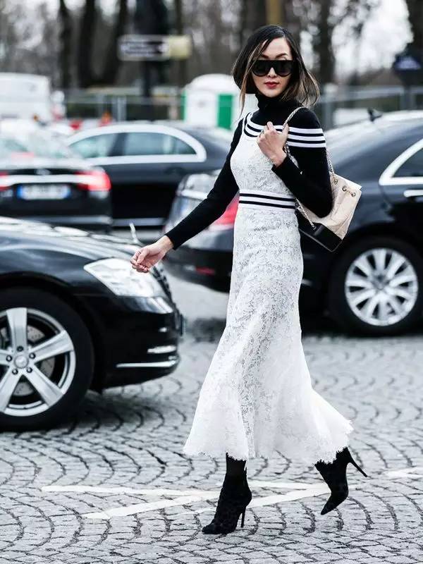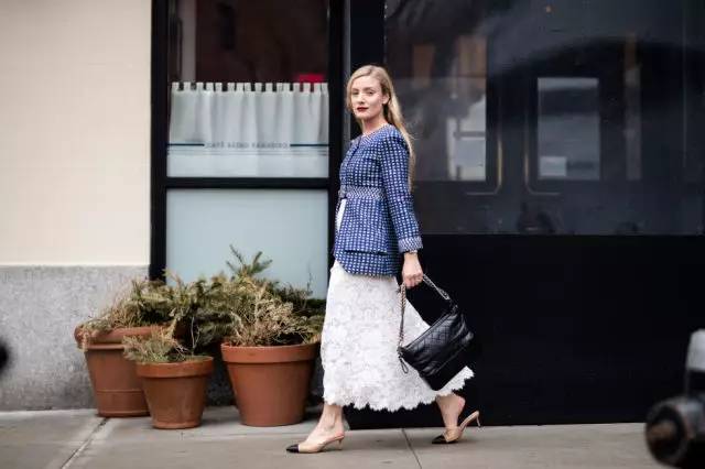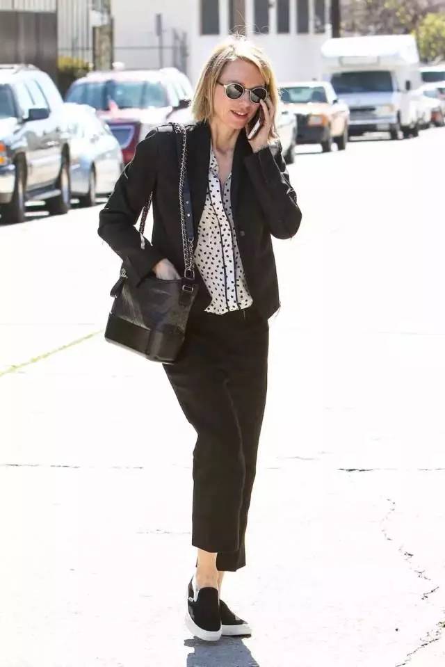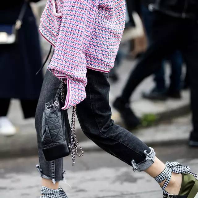 黑白拼色的這只束口包在街拍里出現的頻率很高: