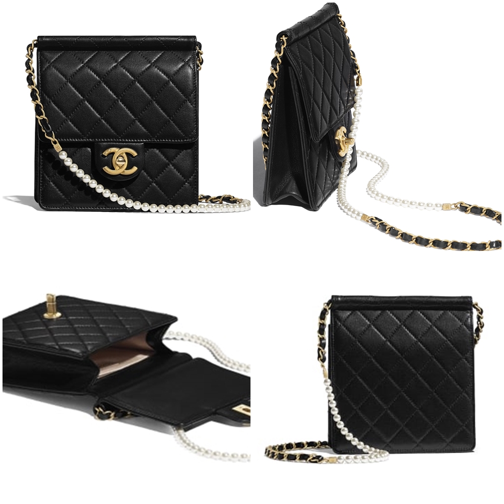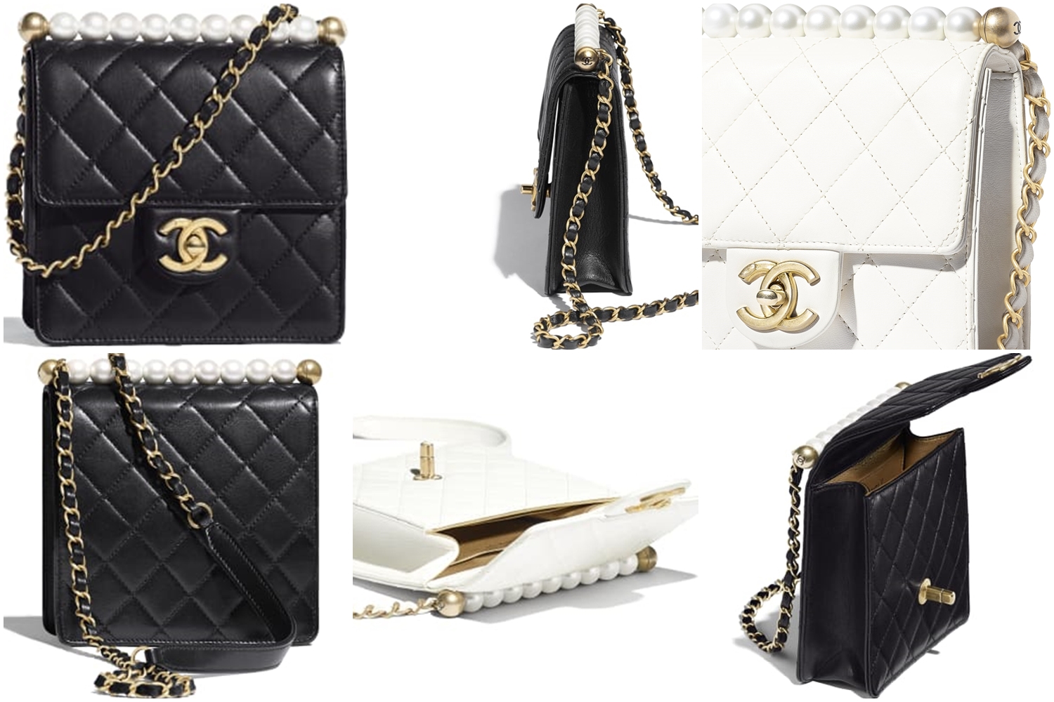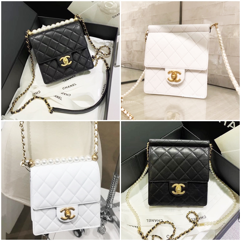 這款珍珠設計的CF直方包共有兩款不同款式,包蓋上緣排列珍珠款,以及小珍珠鏈帶款,且在包型設計上有些微不同,但都擁有品牌一貫精致細膩的細節~,基本上包內空間都是單層隔間,但卻也十分足夠好裝,目前臺灣官網上提供黑、白兩色可參考,真的是美翻了!可以說是2019女孩們的集體許愿款了