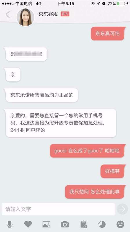 該網(wǎng)友為此吐槽京東說:“我很郁悶,在京東直營還能買來假貨,gucc 那個i呢?被你吃了啊。”