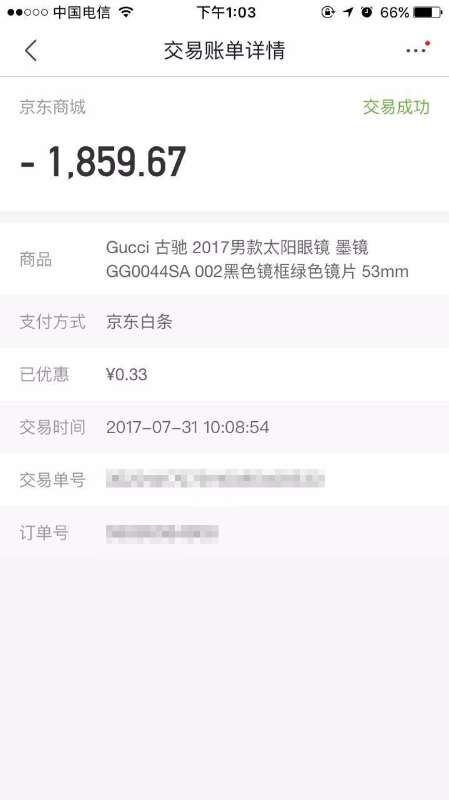 馮先生提供的京東商場“交易賬單詳情”顯示,他購買的商品是Gucci古馳2017男款太陽眼鏡 墨鏡GG0044SA002黑色框綠色鏡片53mm;價格為1859.67元;交易時間為2017年7月31日10:08:54。