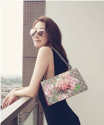 早在它成為眾多女星以及街拍潮人的迷妹前,全智賢就是最先背它出門的那一批女星,作為Gucci的代言人,女神和酒神包的氣質超配噠。這款酒紅色麂皮絨點綴的花卉款明星潮人們背的最多。現在也就數這款和蟲鳥款最火。