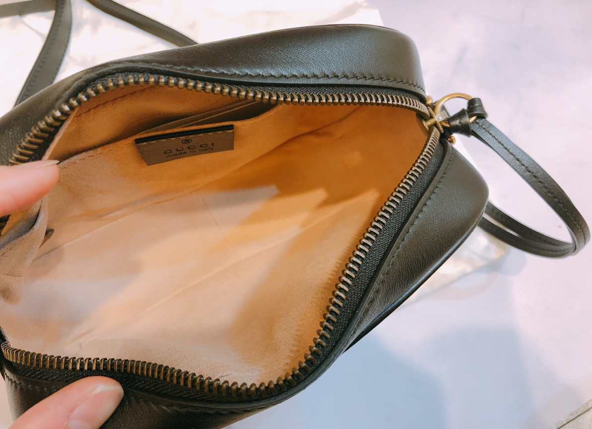 內(nèi)里材質(zhì)為高質(zhì)感麂皮,采單一夾層,但有小側(cè)袋,在側(cè)袋上也有縫上Gucci的Logo 皮革