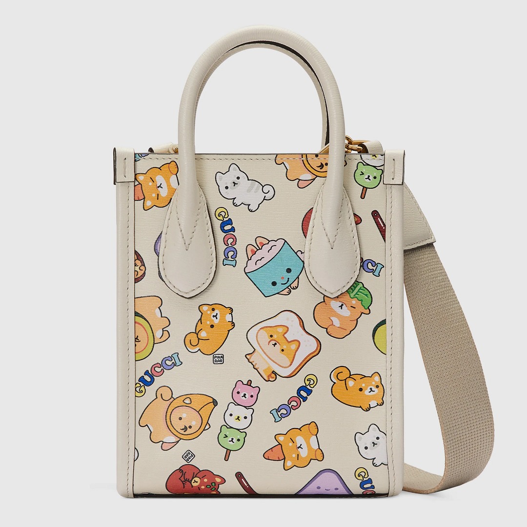 豎款迷你托特包和 Padlock 迷你手拎包采用白色皮革襯托繽紛童趣的小動物插畫,柴犬、貓咪、小兔子、小熊貓們齊聚一堂,還有牛油果🥑、吐司🍞、飯團🍙等輔助選手登場,萌趣圖案非常討喜。