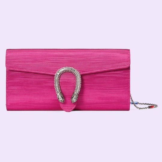 這組 Dionysus 酒神包和 GG Marmont 絎縫包采用柔滑的絲緞或云紋織物面料制作,亮點是最具辨識度的包扣鑲嵌璀璨水晶裝飾,與水晶鏈條肩帶相輝映,無論什么場景都成為引人注目的焦點。