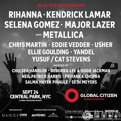 2016年9月24日周六,一年一度的慈善盛事– 2016 Global Citizen音樂節將在紐約中央公園大草坪隆重開幕,主要表演嘉賓包括Rihanna, Kendrick Lamar, Selena Gomez, Major Lazer與Metallica。本次音樂節將匯集世界各地數百萬Global Citizen活動參與者的行動倡議,呼吁全球領導人著力實現聯合國去年提出的全球目標(Global Goals)。